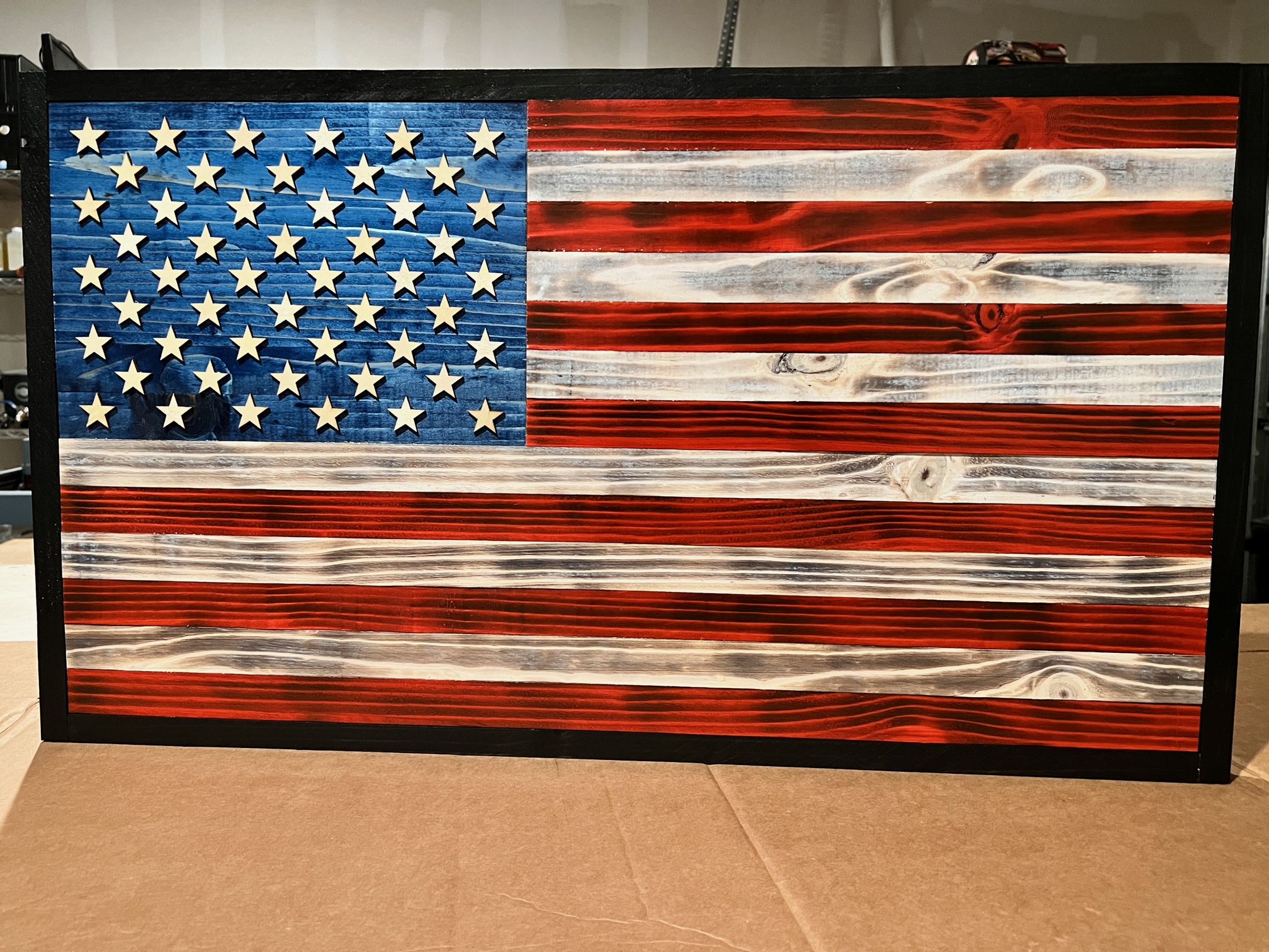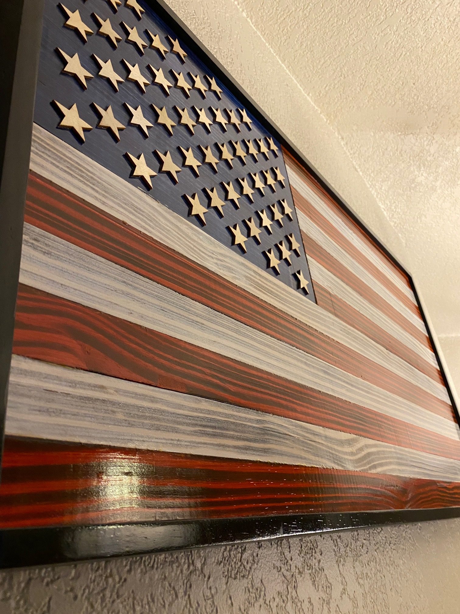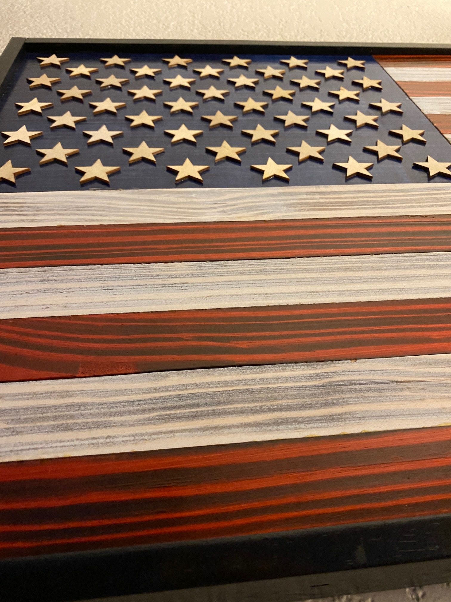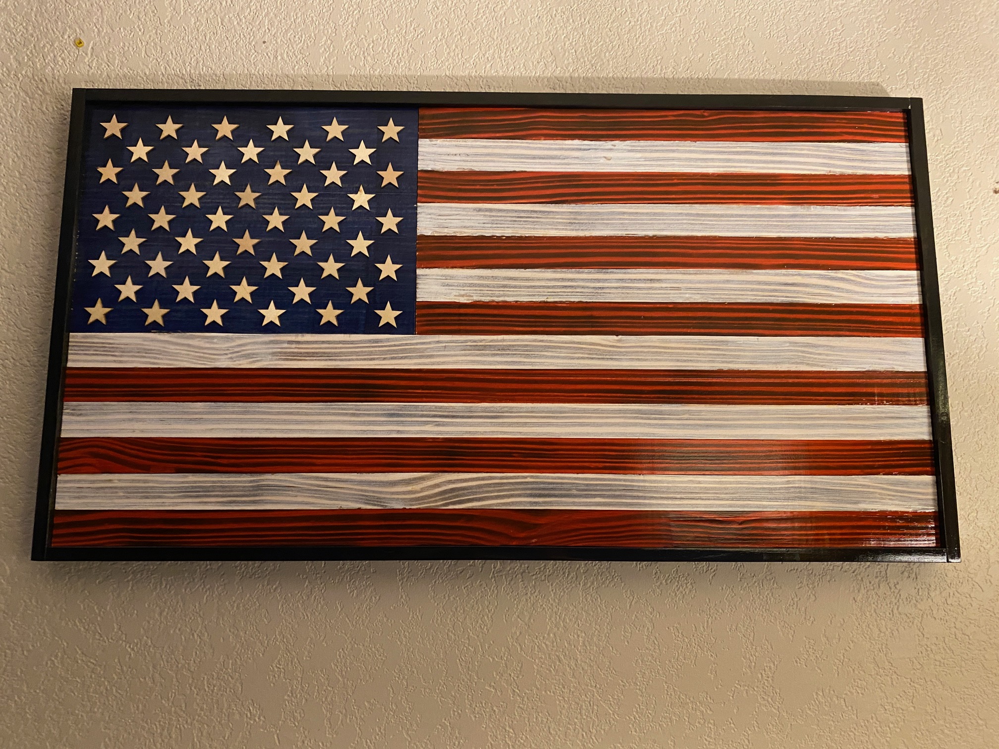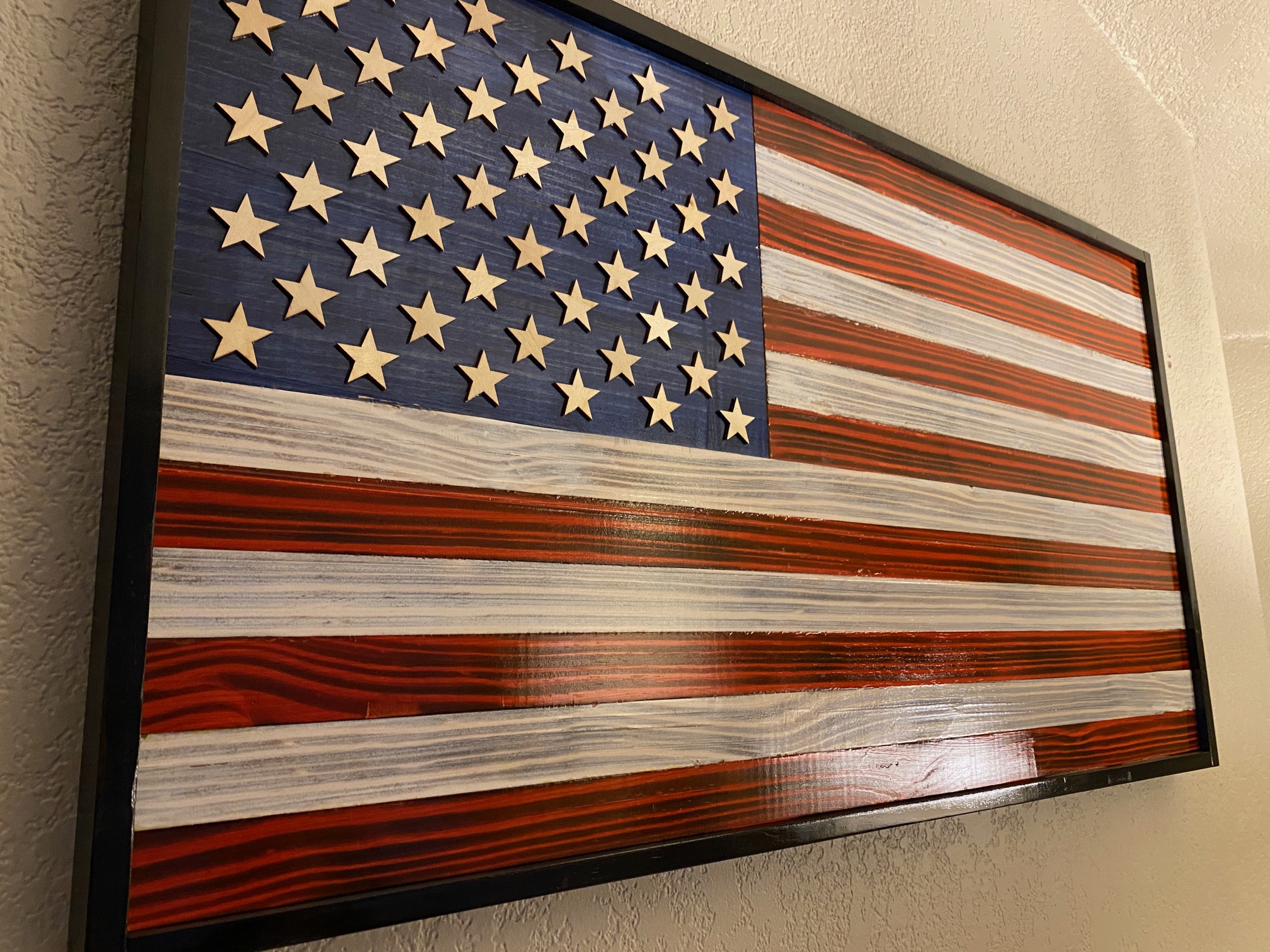 Made with handpicked quality pine wood. Laser cut 1/8-inch stars on a planned union. 2 D-ring hangers on back for easy mounting.